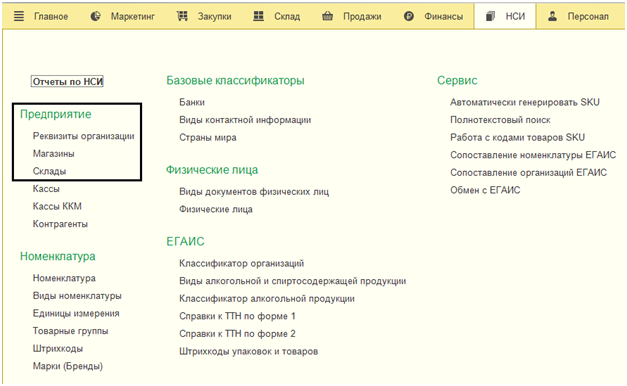 Чтобы создать структуру для своего предприятия, необходимо перейти во вкладку НСИ. Это нормативная и справочная информация, которая характеризуется данными о компании, ее магазинах и складах.