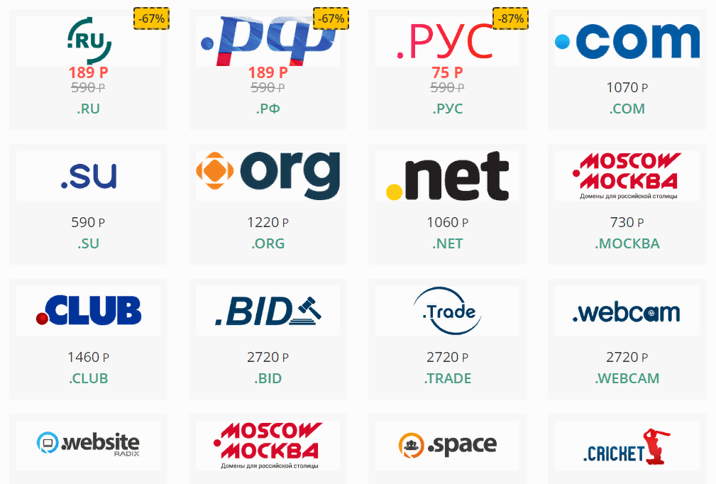 - reg.ru: стоимость годовой регистрации домена «.рф» — 199 рублей, со второго и с пятого – скидки до 7 %;