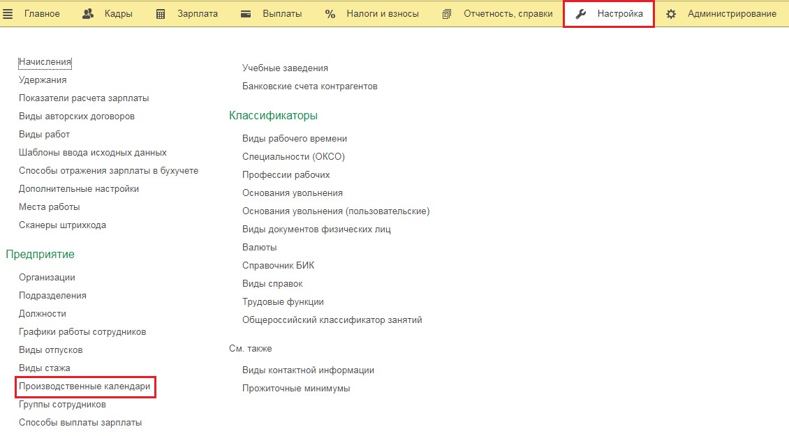 Для проверки программы 1С: Зарплата и управление персоналом, редакция 3.1 следует выбрать раздел «Настройка» и перейти в пункт «Производственные календари».