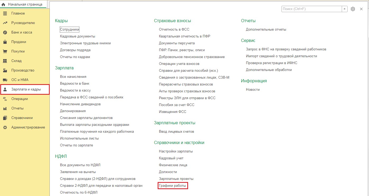 В самой программе: Бухгалтерия предприятия они располагаются во вкладке «Зарплата и кадры» — «Графики работы».