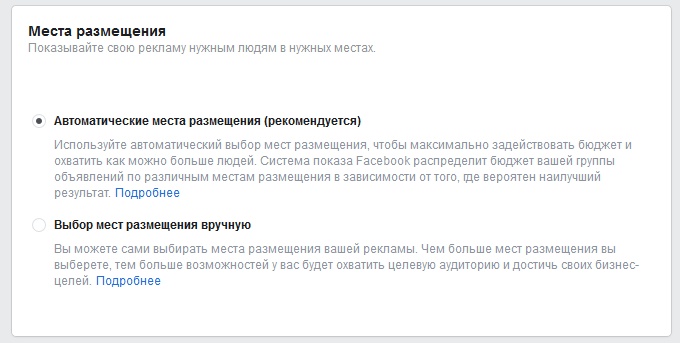 В следующем блоке мы можем выбрать место, где будет показываться реклама. По умолчанию стоит автоматическое место размещения. То есть реклама будет показываться везде, где она подходит в зависимости от цели. Этого оставлять не нужно. Мы будем настраивать вручную.