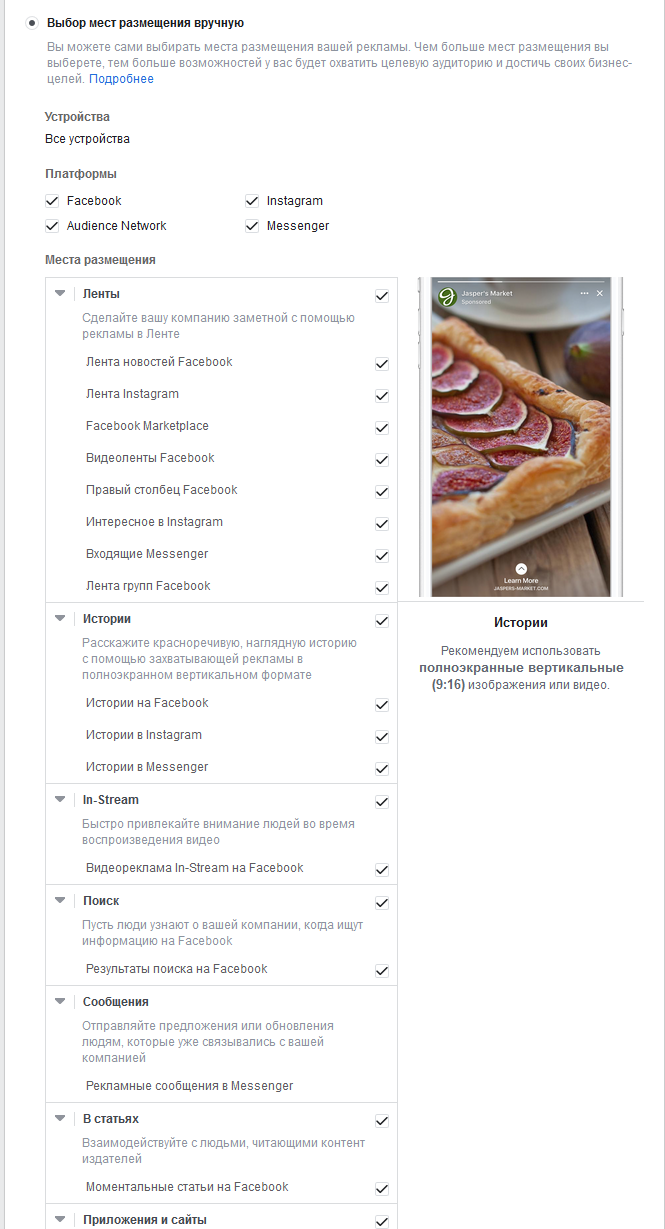 Нажимаем «Выбор мест размещения вручную». Тут у нас есть Фейсбук, Инстаграм, Мессенджер и Audience Network.